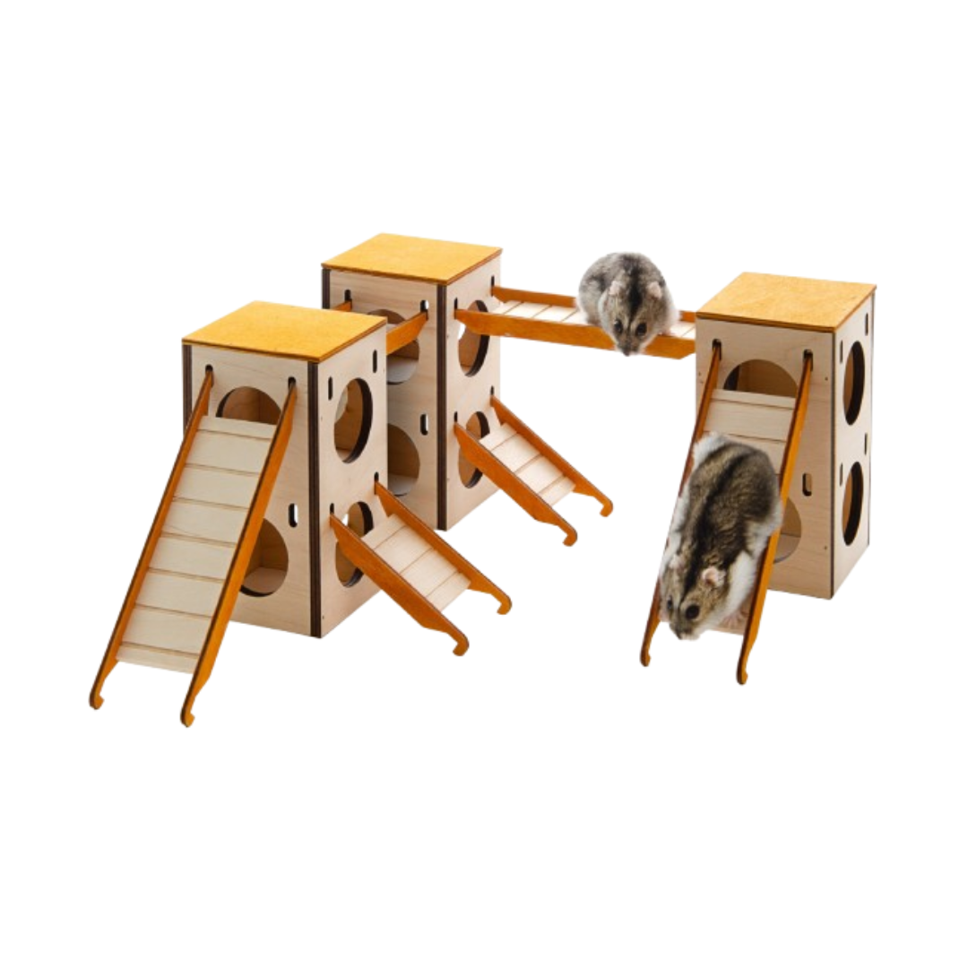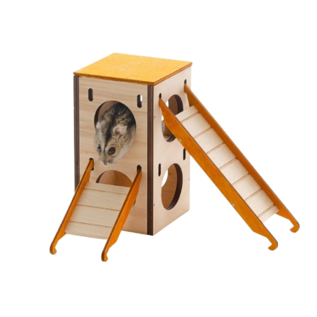 Malý drevený domček pre škrečky. Domček v tvare veže je vyrobený z preglejky a je namaľovaný zdravotne nezávadnými a netoxickými farbami. Domček má vnútorné skryté poschodie a dva rebríky. Domček je ideálna skrýša pre škrečky. Doprajte svojmu hlodavcovi bezpečné miesto na odpočinok. Kombináciou viacerých domčekov vytvoríte veľké preliezky a škrečky si užijú veľa zábavy.