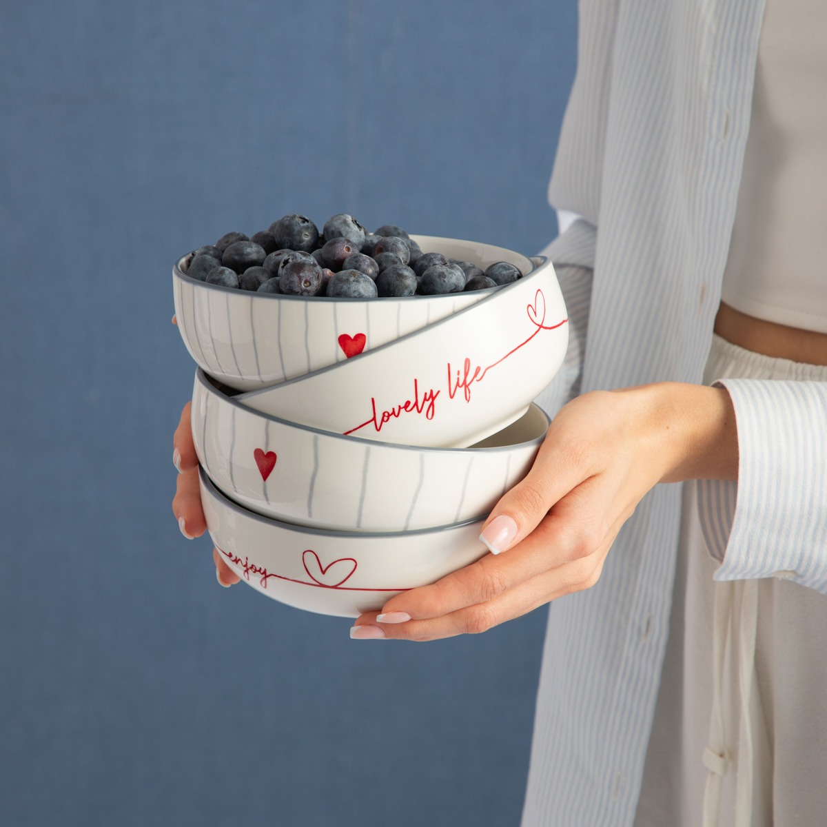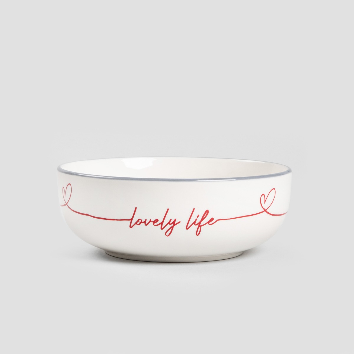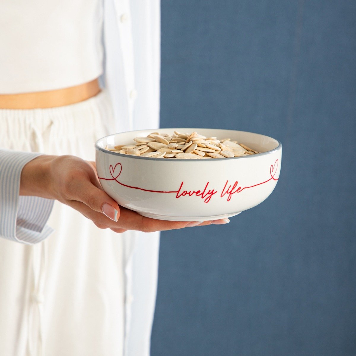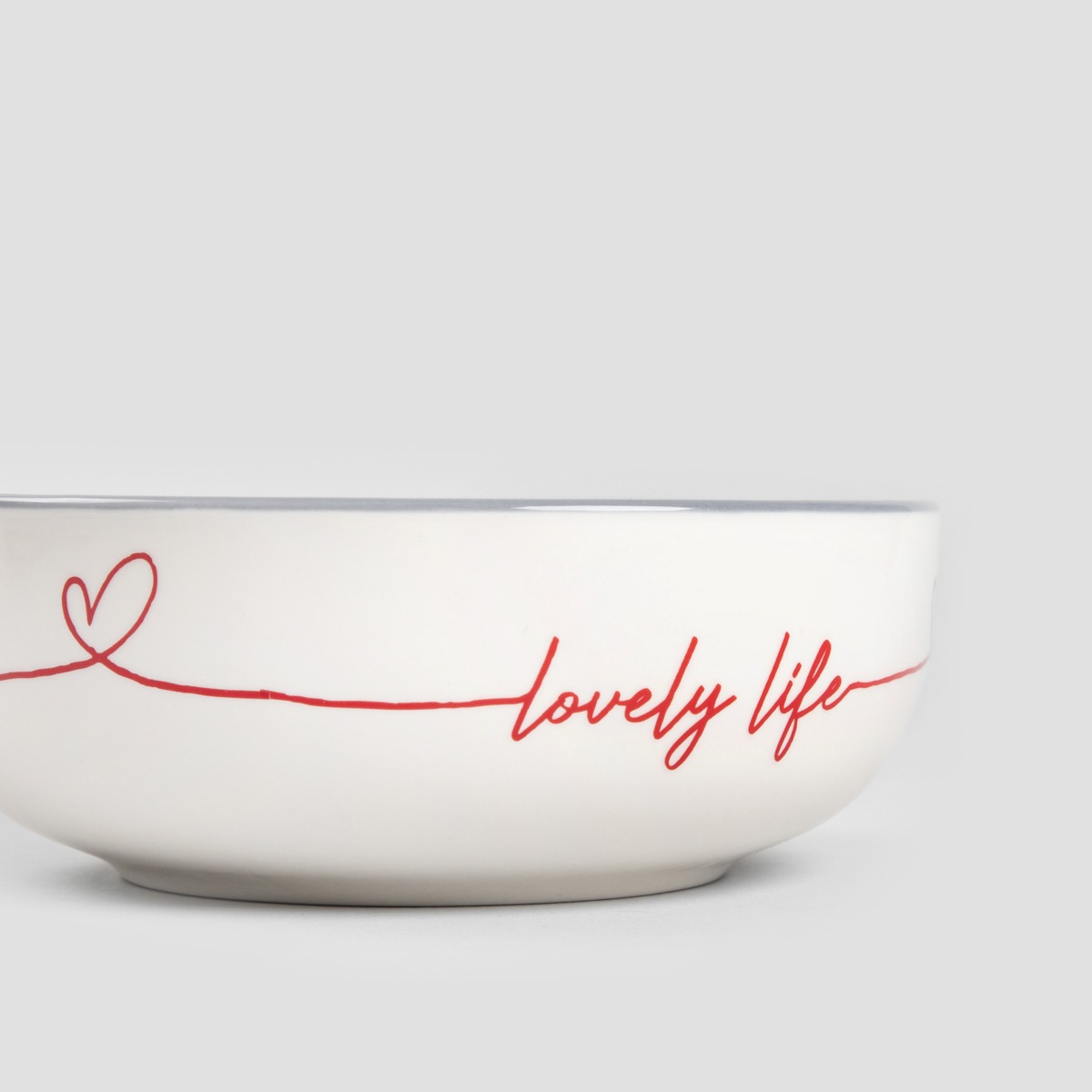Miska LOVELY LIFE s pôvabným nápisom a motívom srdca nám pripomína, aby sme si užívali každý okamih. Jemná biela farba porcelánu, červený akcent a tenký sivý okraj vytvárajú ľahký, no zároveň osobitý celok, ktorý si nájde svoje ideálne miesto v každom prostredí.