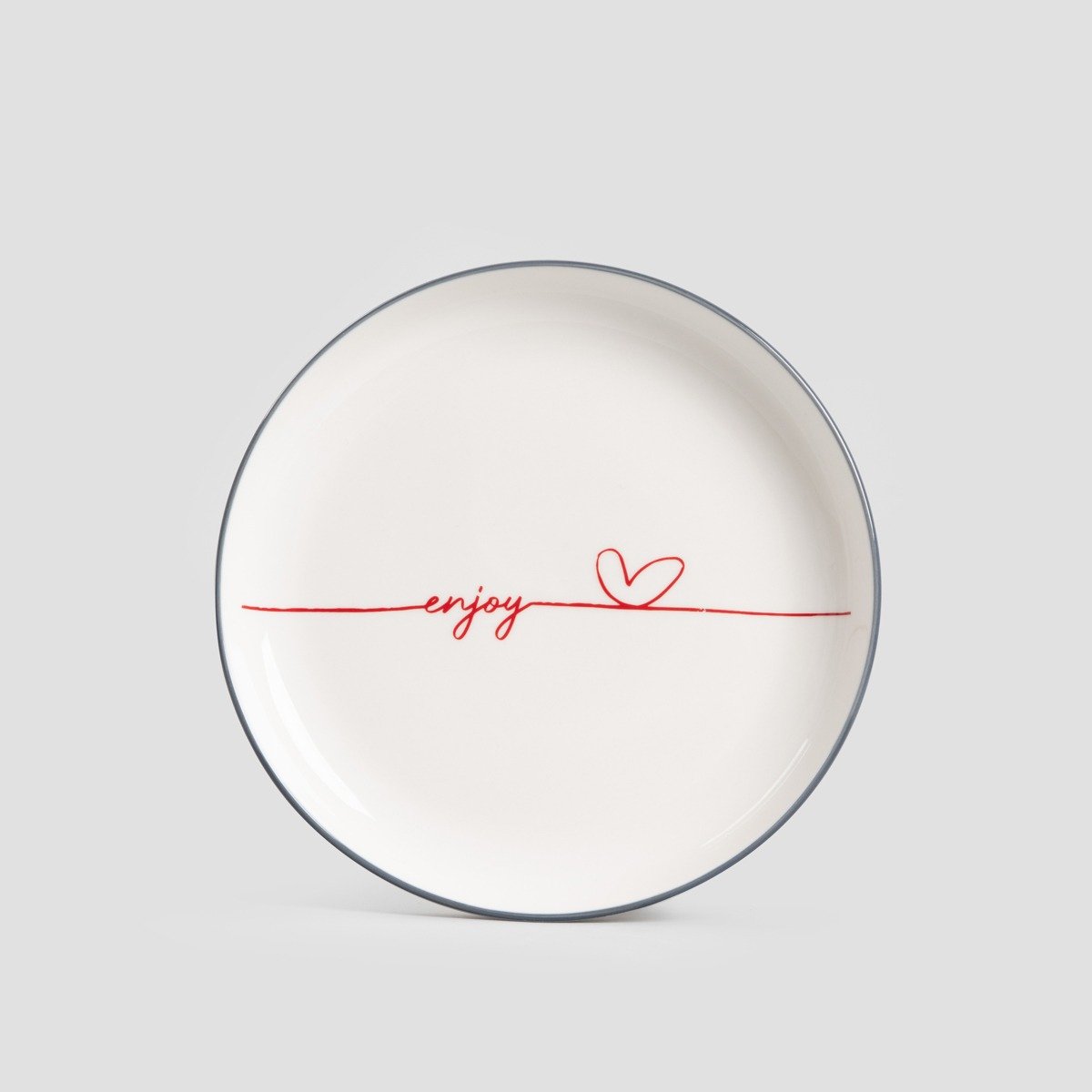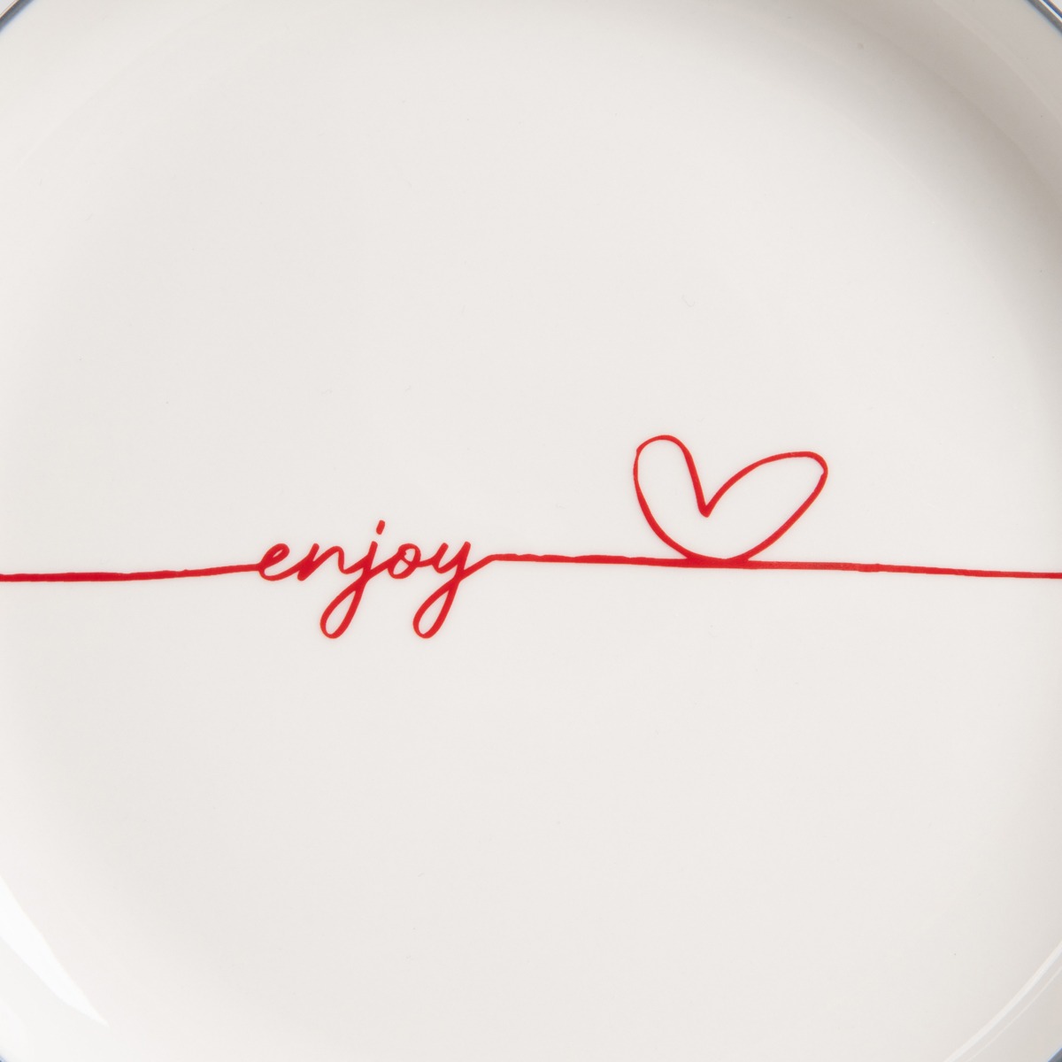 • Biely porcelán s červeným nápisom „enjoy“ a srdcom